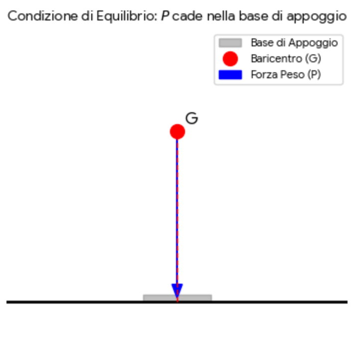 per poter restare in piedi il corpo deve rispettare una condizione geometrica precisa: la proiezione verticale del baricentro deve cadere all’interno della base di appoggio. se il baricentro esce da questa base il corpo subisce una rotazione e cade.